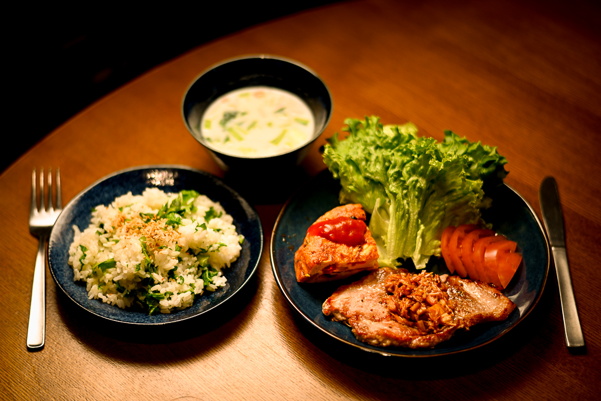 夜はポークステーキにえのきのみじん切りバター醤油炒めをかけた。あとはオムレツとわさび菜の菜飯。ちょっとわさび菜入れすぎたかと思ったけどこのぐらいの方がウマいね。