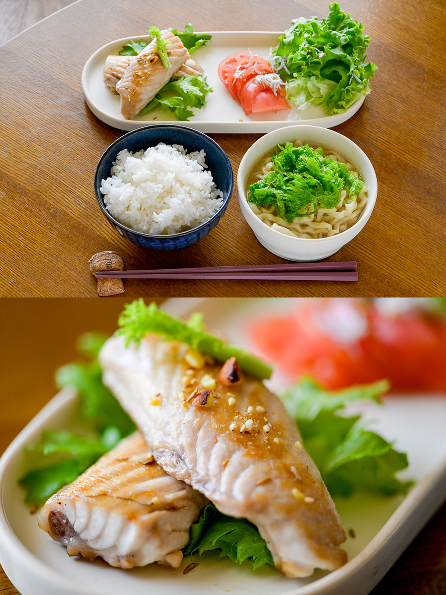 朝昼はちょこちょこっと色々食べた。で、晩御飯は焼き手びち丼。今日は手びちと大根を煮てともに焼いた。上にわさび菜を乗せて汁物はモズクとアオサのすましにした。
