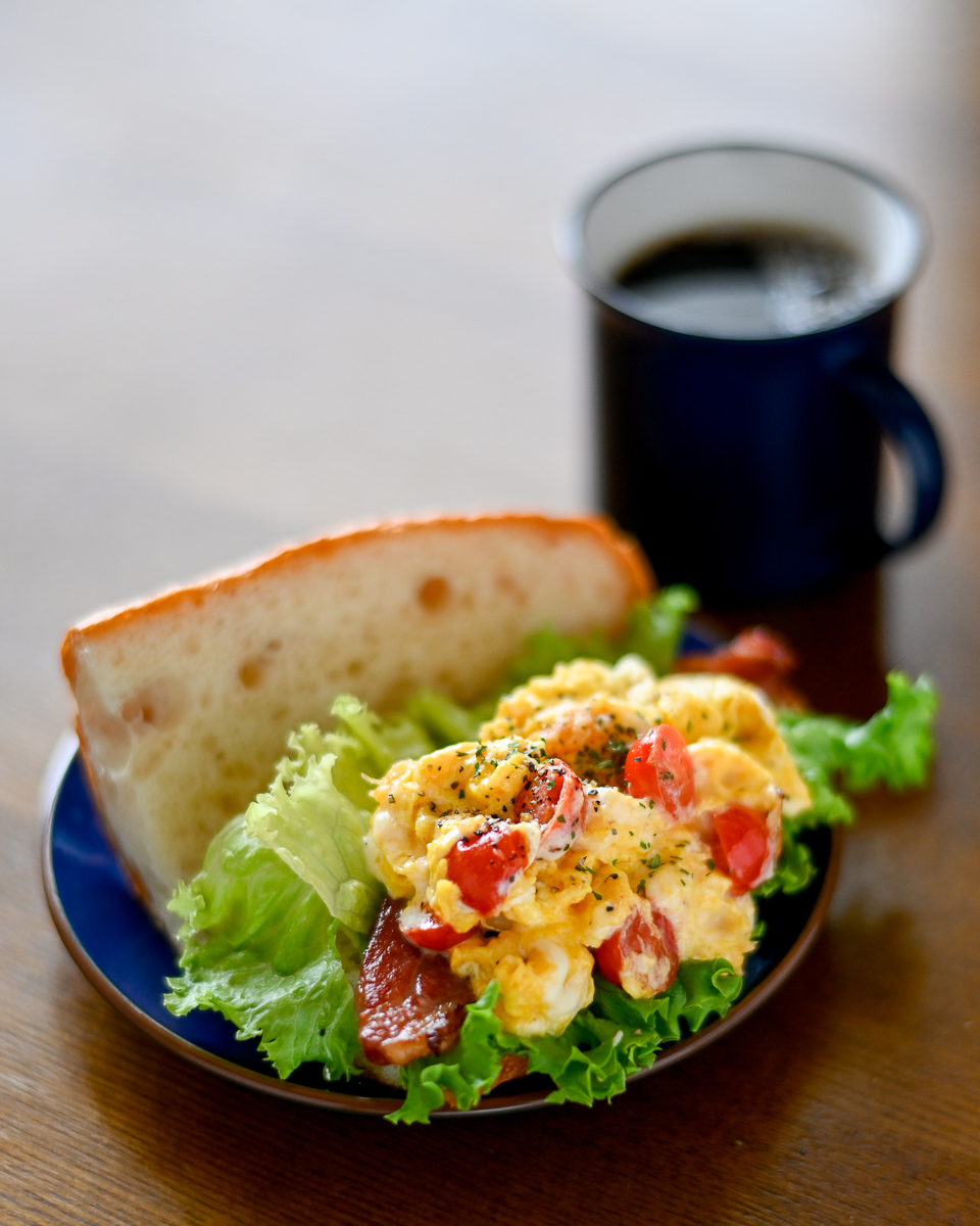 昼はベーコンにトマトとチーズのスクランブルエッグのせ。