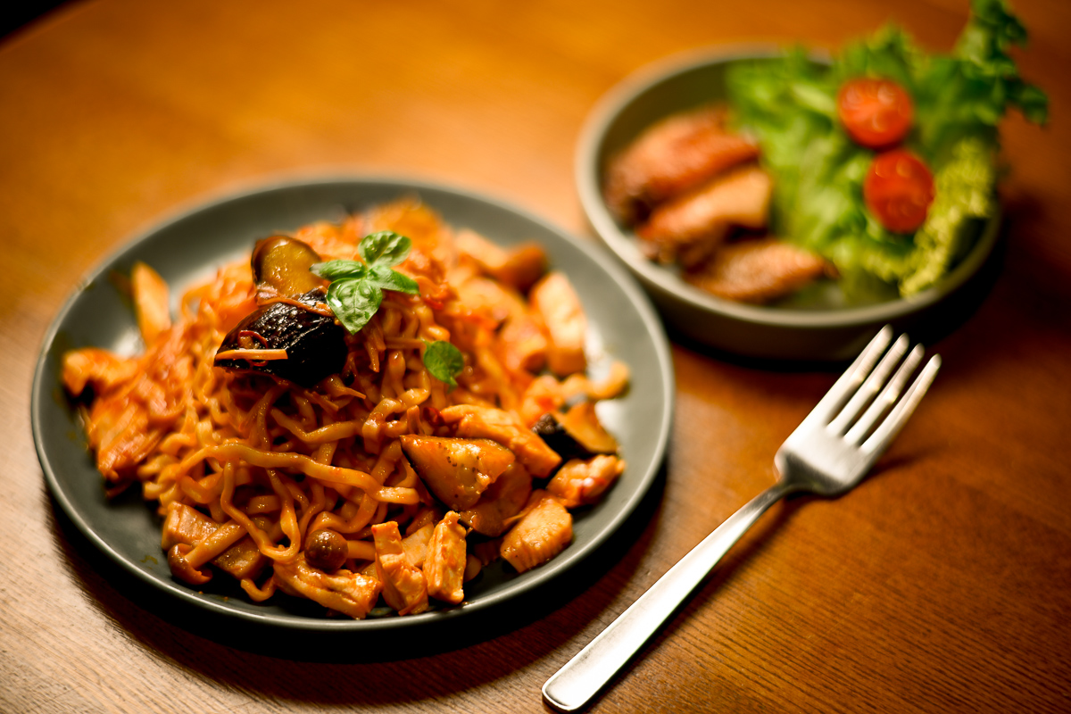 昼は昨日の沖縄そばの残りでつけそば。ニラモヤシ炒めと鶏ハムを添えた。