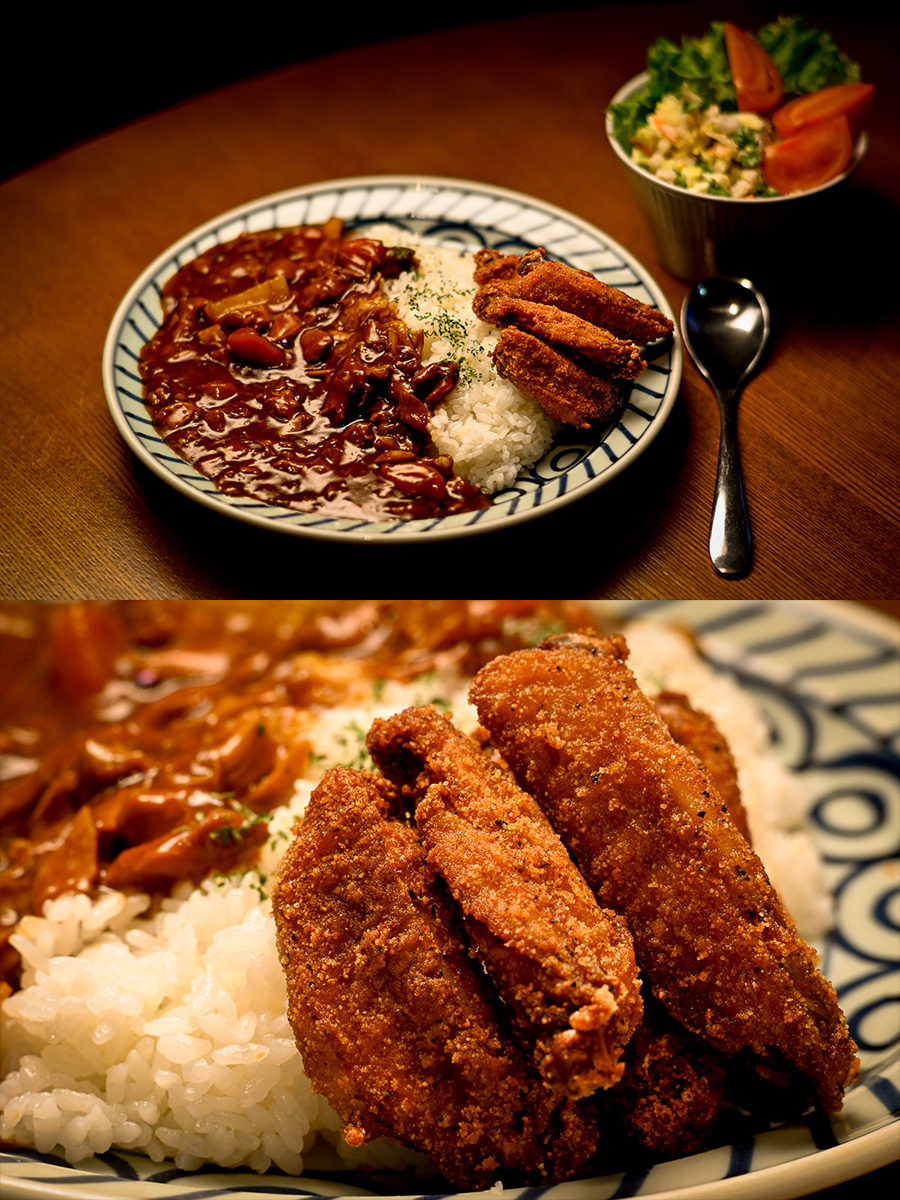 夜はチキンカレー。今日のは鶏ももを圧力鍋でボロボロになるまで煮込んだタイプ。手羽中のから揚げを添えた。サラダはコールスロー。