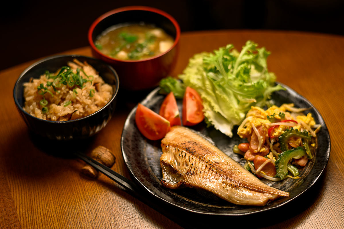 晩御飯はホッケの塩干に身にゴーヤーチャンプルー。ご飯は乾燥野菜を出汁で戻して炊き込んだ。