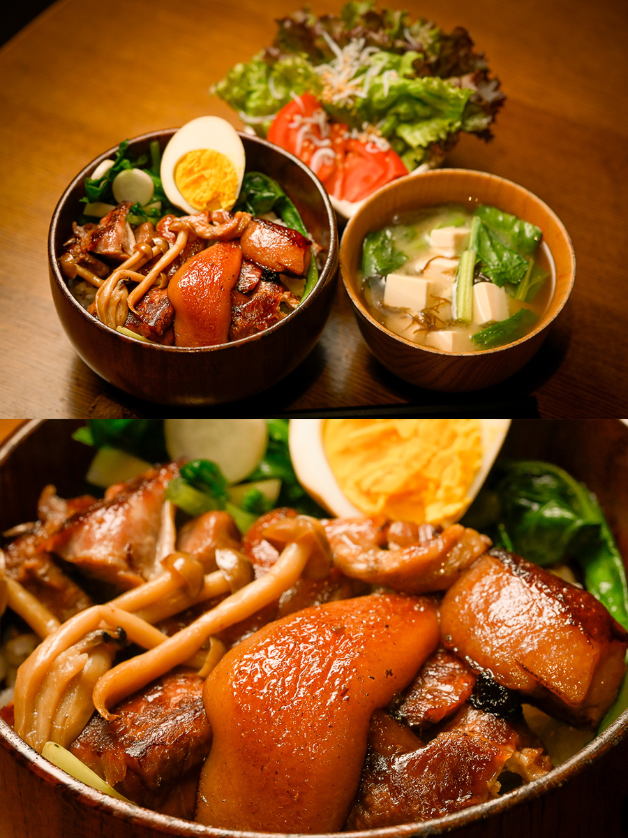 晩御飯は焼きテビチ丼。今日のはしめじなんかも入れたよ。