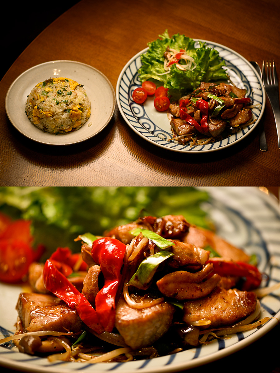 晩御飯はチャーハンと豚ロースと野菜のオイスターソース炒め。オイスターだけだとパンチに欠けるんでちょこっと焼肉のタレ的なのを足す。チャーハンはしらすと高菜で和風寄り。