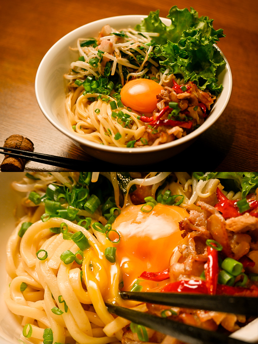 晩御飯はひとりメシだし遅かったんで沖縄そばのまぜそば。ニラもやしと豚バラ炒めをのっけた。