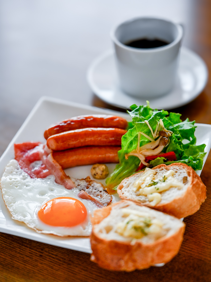 朝ご飯は無性にソーセージを食べたくなったんでソーセージとベーコンと卵。こんな程度の色でもコントロールが非常にめんどくさいね。