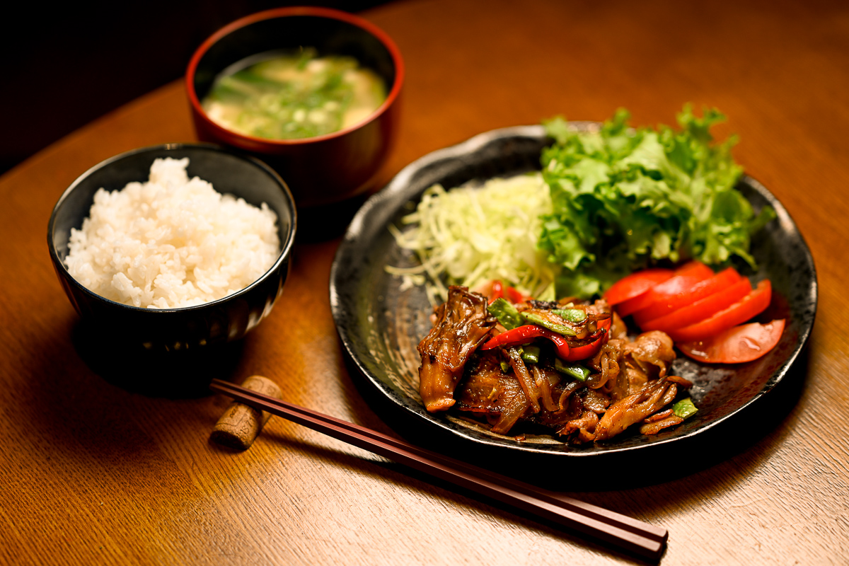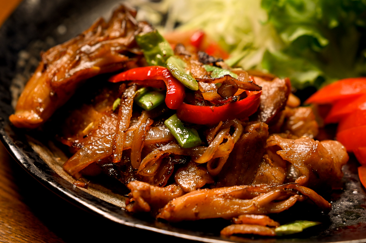 晩御飯は豚バラの生姜焼き。いわゆる生姜焼きだと色味がないんで赤ピーマンとかいんげんとか舞茸とかも一緒に。