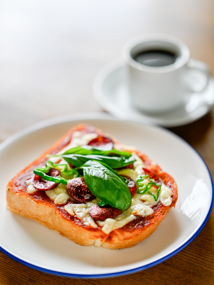 こないだは昭和のピザトーストだったけど今日は平成のピザトーストw バジルの葉とオリーブオイルが乗っただけwww