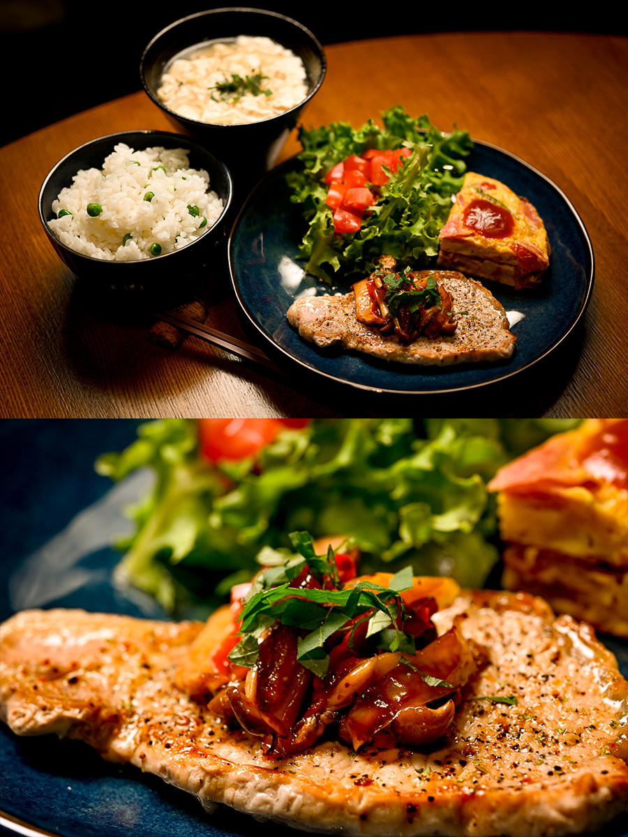 晩御飯は豚ロースのソテーにキノコのバター醤油乗せ。フリッタータとゆし豆腐モドキな沖縄そば。傷みやすいものをどんどん使うw