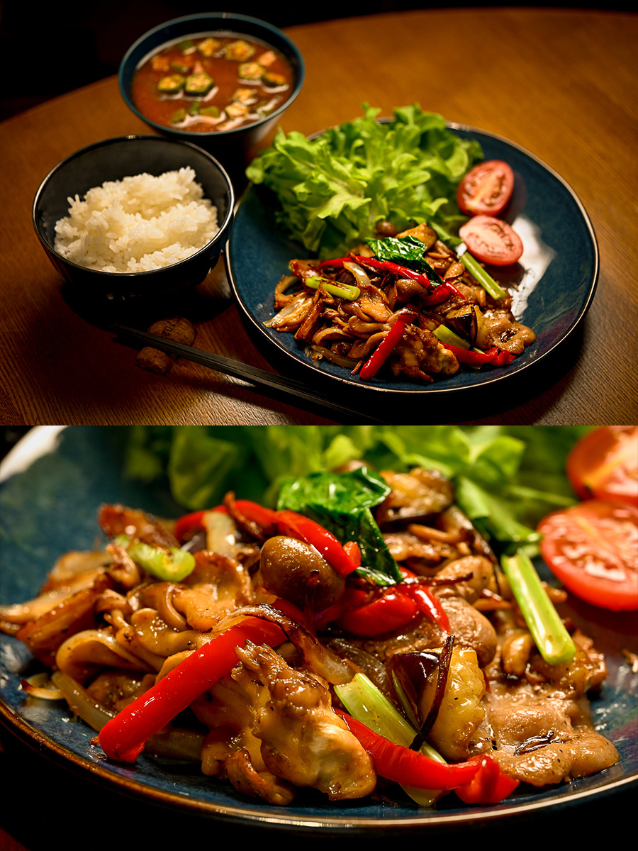 晩御飯は豚バラと数種のキノコと野菜のガリバタ醤油炒め。遺憾これはごはんがススム君だな。