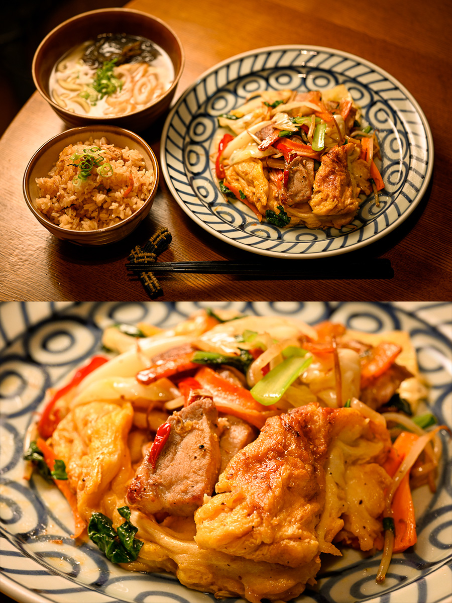 何となく晩御飯は沖縄セットw フーチャンプルーとジューシーとミニ沖縄そば。今日のは麩を大き目にしたんだけどこの方がウマいね。たまごをたっぷり吸ってるんでふわふわに麩のシコシコ感があって独特なうまさになる。