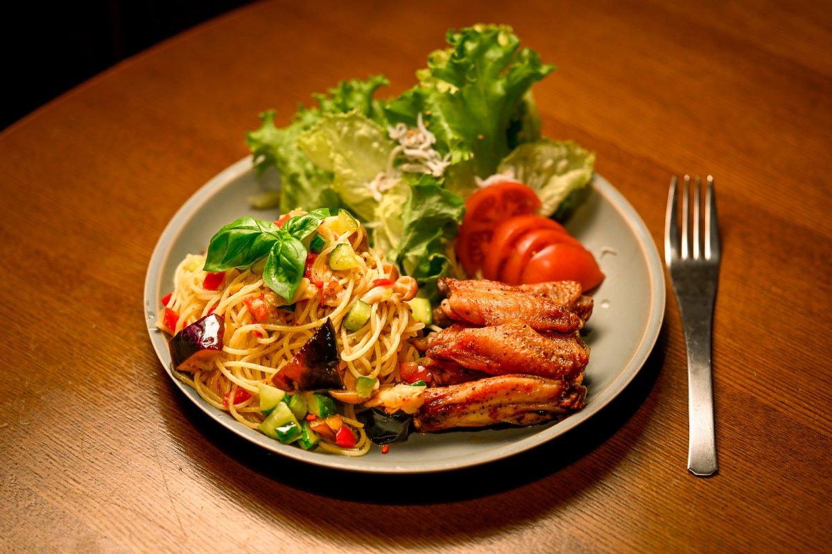 夜は手羽中のスパイス焼きと野菜のペペロンチーノ。