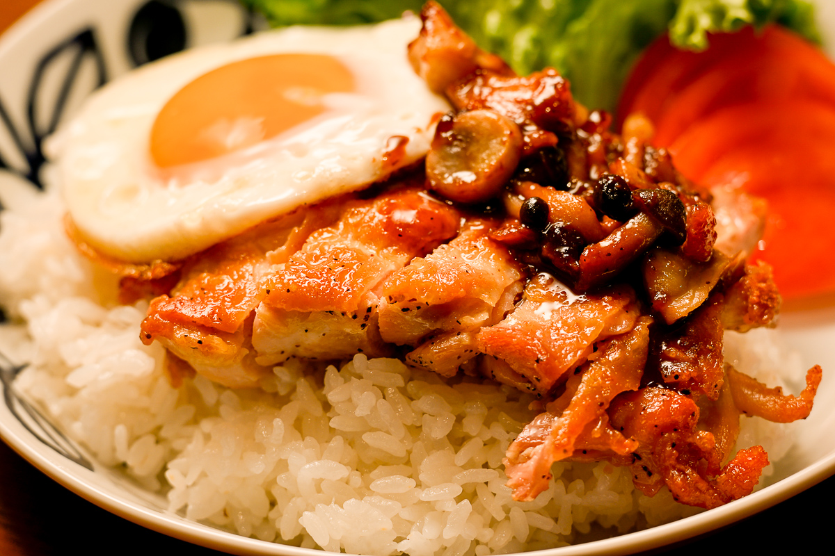 夜はチキンロコモコと言うかチキンオーバーライス。鶏モモのバター焼きの上にガリバタ醤油炒めのキノコと目玉焼きを乗っけてかき混ぜて食べる。