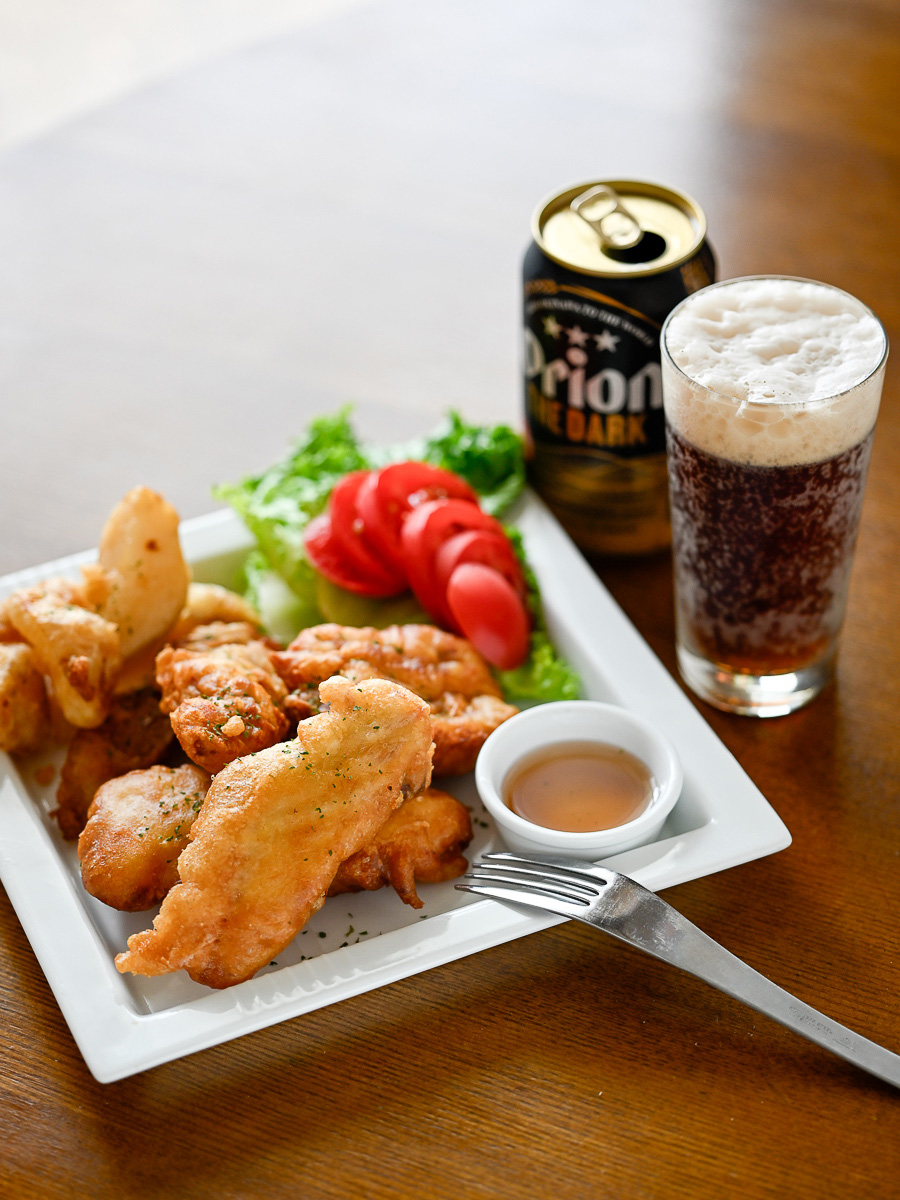 一転してこれまたどんより。ほんとに不安定な天気だな。オリオンからTHE DARKとか言う黒いやつが出てるんで昼間っからお試し。黒といえば英国風だろって感じでマグロハラスでフィッシュ&チップス。もともとのオリオンドラフトがかなり軽めなビールなんで見た目ほどの重さはないね。まぁコクとかはかなり増してるけど全体的な感じで言えばヱビスとかほどじゃない。