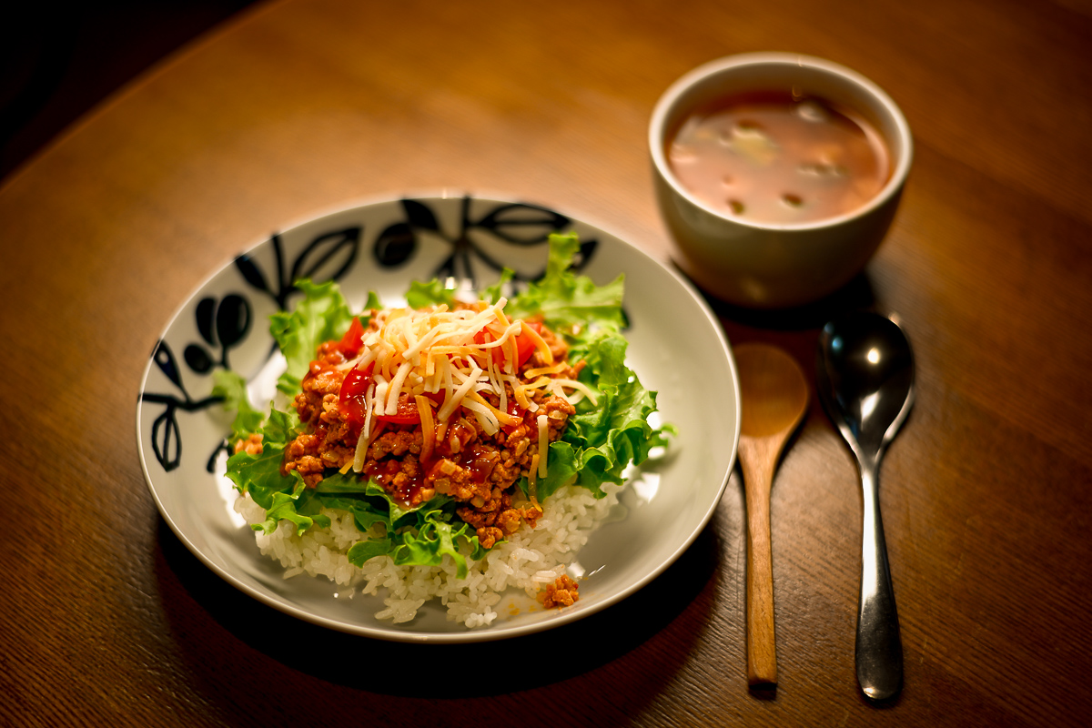 夜はタコライス。一般的な結球レタスを刻んだやつよりリーフレタスの方がきれいだし食べやすい。